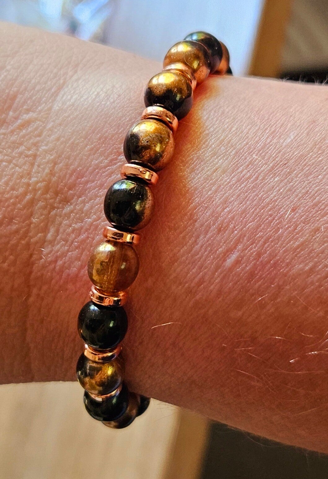 Zwart en goudkleurige armband op elastiek gemaakt.