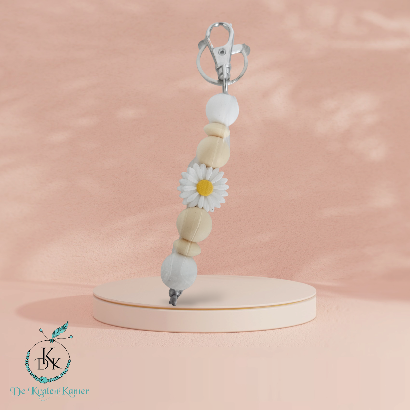 Leuke sleutelhanger met siliconen kralen en roze bloem.